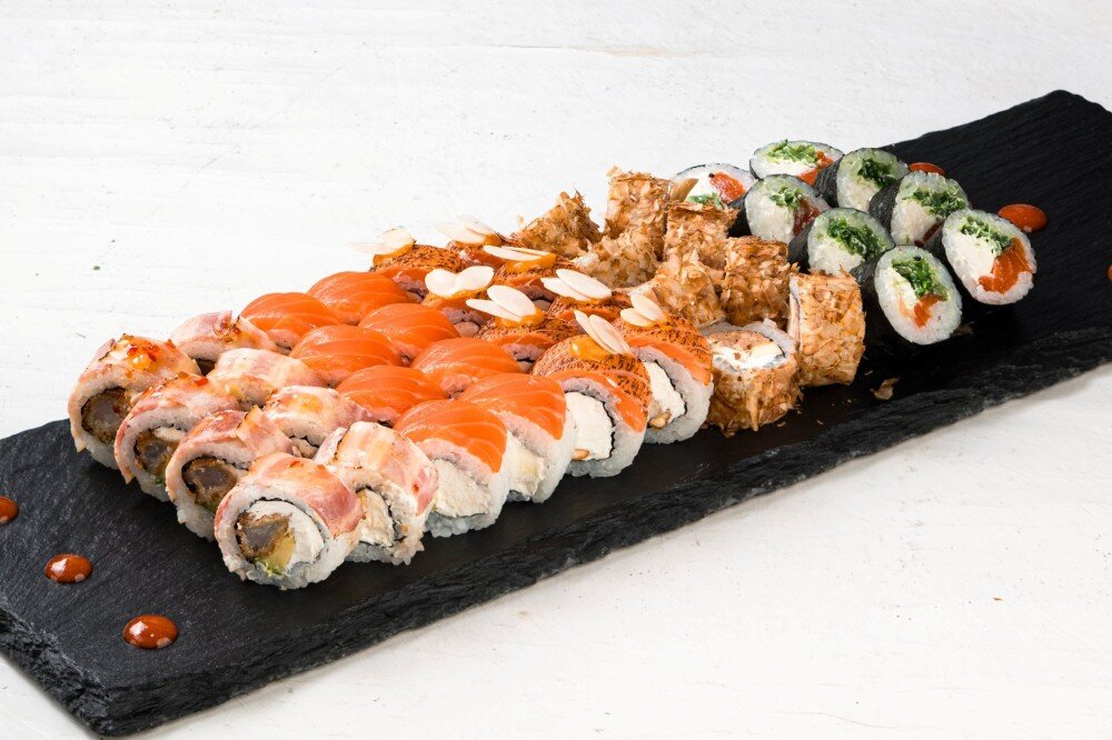 Филадельфия татаки + Креветка в беконе + Филадельфия с авокадо + Бонито с лососем терияки + Мак с лососем и чукой