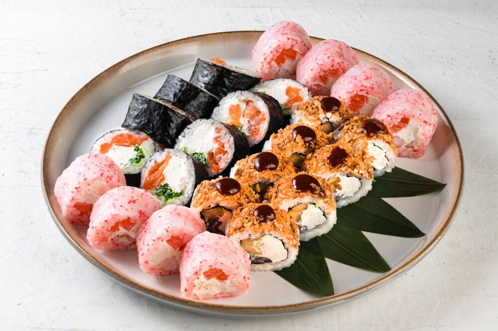 Ролл с жареным луком + Мак с лососем и чуккой + Ролл с креветкой