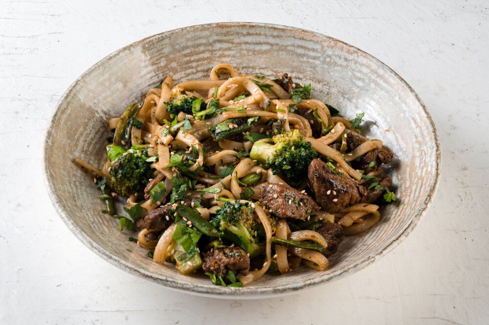 Удон с говядиной и брокколи
